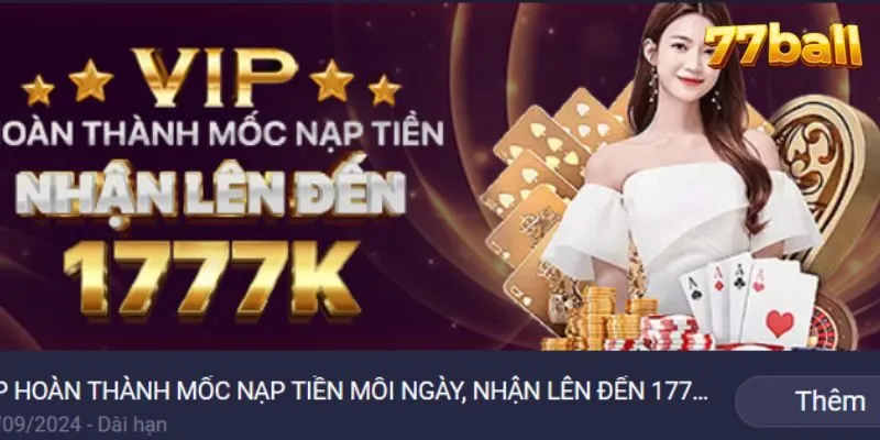 Danh mục khuyến mãi 77ball luôn mang đến những cơ hội gia tăng nguồn vốn cho người chơi thông qua các chương trình thưởng nạp lại hàng ngày. Bạn sẽ được nhận 20% giá trị nạp lại, với mức tối đa lên đến 5,000,000 VND/ngày tại các hạng mục casino trực tuyến, slot game và thể thao.